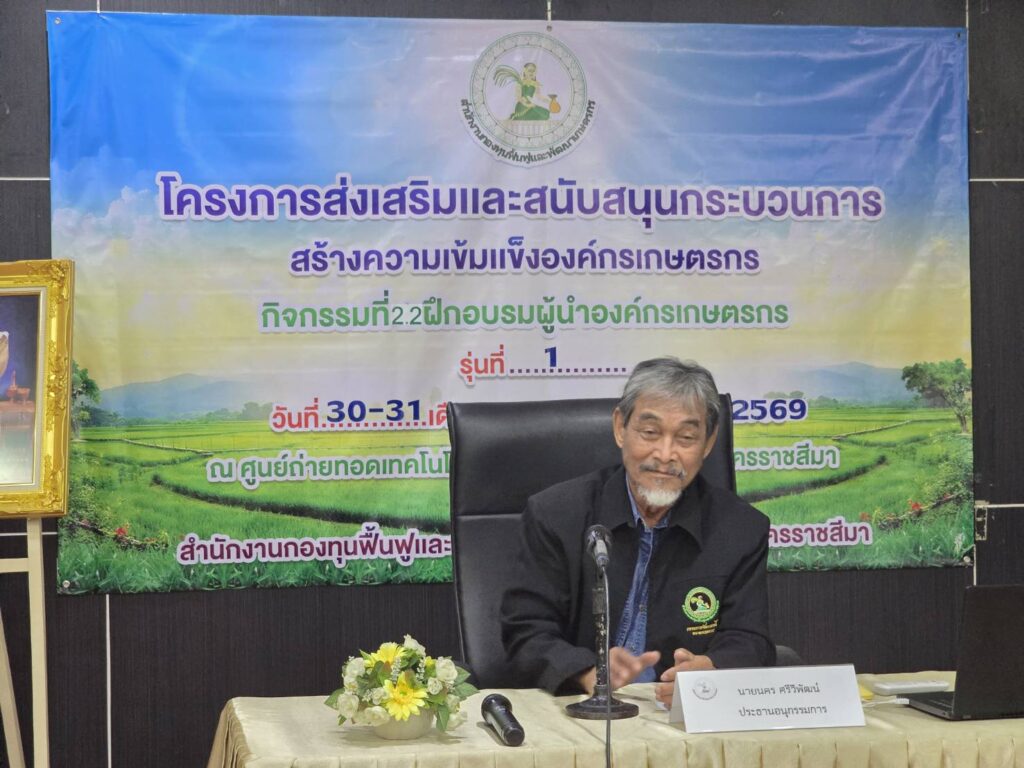 สำนักงานกองทุนฟื้นฟูและพัฒนาเกษตรกร สาขาจังหวัดนครราชสีมาจัดโครงการส่งเสริมและสนับสนุนกระบวนการสร้างความเข้มแข็งองค์กรเกษตรกร กิจกรรมที่ 2.2 ฝึกอบรมผู้นำองค์กรเกษตรกร รุ่นที่ 1 ระหว่างวันที่ 30-31 มกราคม 2569 ณ ศูนย์ถ่ายทอดเทคโนโลยีการสหกรณ์ที่ 5 จังหวัดนครราชสีมา ตำบลหนองบัวศาลา อำเภอเมืองนครราชสีมา จังหวัดนครราชสีมา โดยมีองค์กรเกษตรกรเข้าร่วมจำนวน 10 องค์กร เกษตรกรสมาชิก 50 คน ในการนี้ได้มีนายปริญญา เศวตธรรม ผู้อำนวยการศูนย์ถ่ายทอดเทคโนโลยีการสหกรณ์ที่ 5 ให้เกียรติกล่าวต้อนรับและแนะนำสถานที่ในการจัดโครงการฯ และมีนายนคร ศรีวิพัฒน์ ประธานอนุกรรมการกองทุนฟื้นฟูและพัฒนาเกษตรกร จังหวัดนครราชสีมา เป็นประธานเปิดโครงการส่งเสริมและสนับสนุนกระบวนการสร้างความเข้มแข็งองค์กรเกษตรกร กิจกรรมที่ 2.2 ฝึกอบรมผู้นำองค์กรเกษตรกร และนางสาวอัมพวา เพ็ชรกิ่ง หัวหน้าสำนักงานกองทุนฟื้นฟูและพัฒนาเกษตรกร สาขาจังหวัดนครราชสีมา กล่าวเปิดโครงการฯ